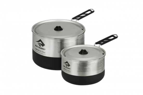 Sada dvou nerezových hrnců o objemu 1.2 a 2.7 litru. Každý je opatřen vlastní poklicí a skládacím držadlem. Hrnce sbalíte do sebe, držadlo po sklopení fixuje poklici a celá sada vám tak zabere jen minimum místa v batohu.