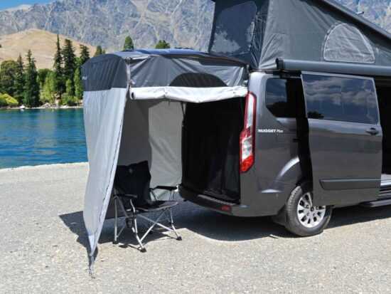Závěs pro soukromí, který se snadno montuje a který je vybaven dvěma zipy, vám nabízí rozšíření vašeho obývacího prostoru. Kromě toho poskytuje sluneční a vizuální ochranu a je ideální propoužití vaší venkovní sprchy. Závěs pro ochranu soukromí se připevňuje k zadním dveřím pomocí suchých zipů a lze jej připevnit k zemi pomocí stanových kolíků.
